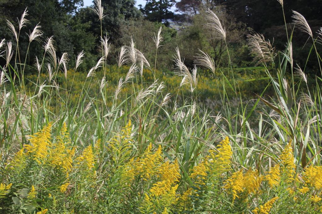 En los bordes del terraplén más alto donde nos encontramos crecen grandes flores amarillas como la seitaka awadachi-sou (Solidago altissima).
