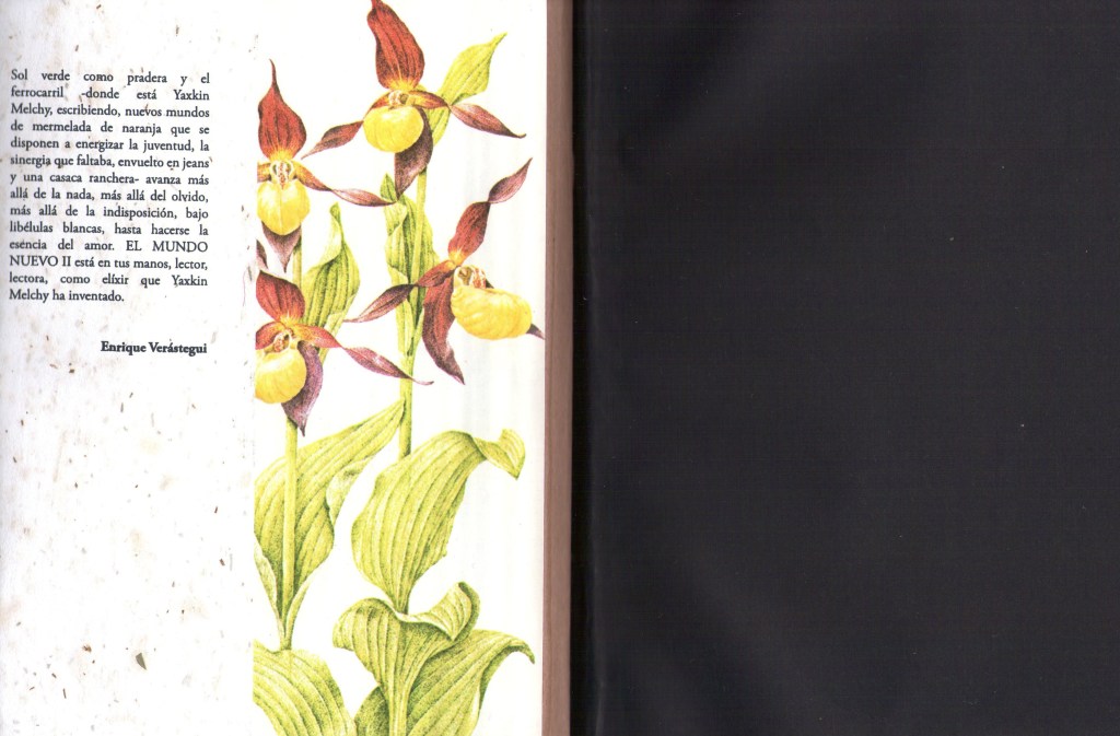 «Sol verde como pradera y el ferrocarril —donde está Yaxkin Melchy, escribiendo nuevos mundos de mermelada de naranja que se disponen a energizar la juventud, la sinergia que faltaba, envuelto en jeans y una casa ranchera— avanza más allá de la nada, más allá del olvido, mas allá de la indisposición, bajo libélulas blancas, hasta hacerse la esencia del amor. EL NUEVO MUNDO II está en tus manos lector, lectora, como elíxir que Yaxkin Melchy ha inventado.»