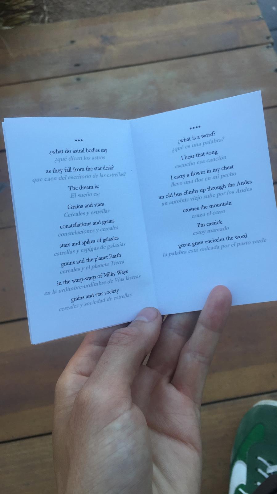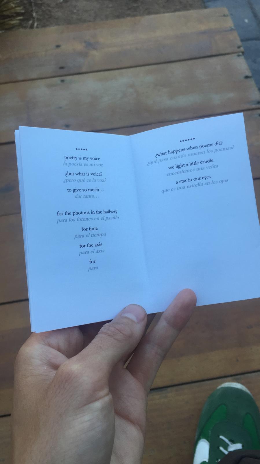 Also, the book object El ADN del canto / The Song’s DNA, translated by Ryan Greene and published by Spiral Editions in New York, was published a couple of months ago. The bilingual book stands out for its handcrafted, double-sided design, printed in green ink, and includes a strip of paper with seeds, part of the concept of a plant seed growing in a glass jar. For me, poems are also seeds, but in a different form, and books are like envelopes with seeds. Some germinate, others don’t. But they all share the same DNA: the word.