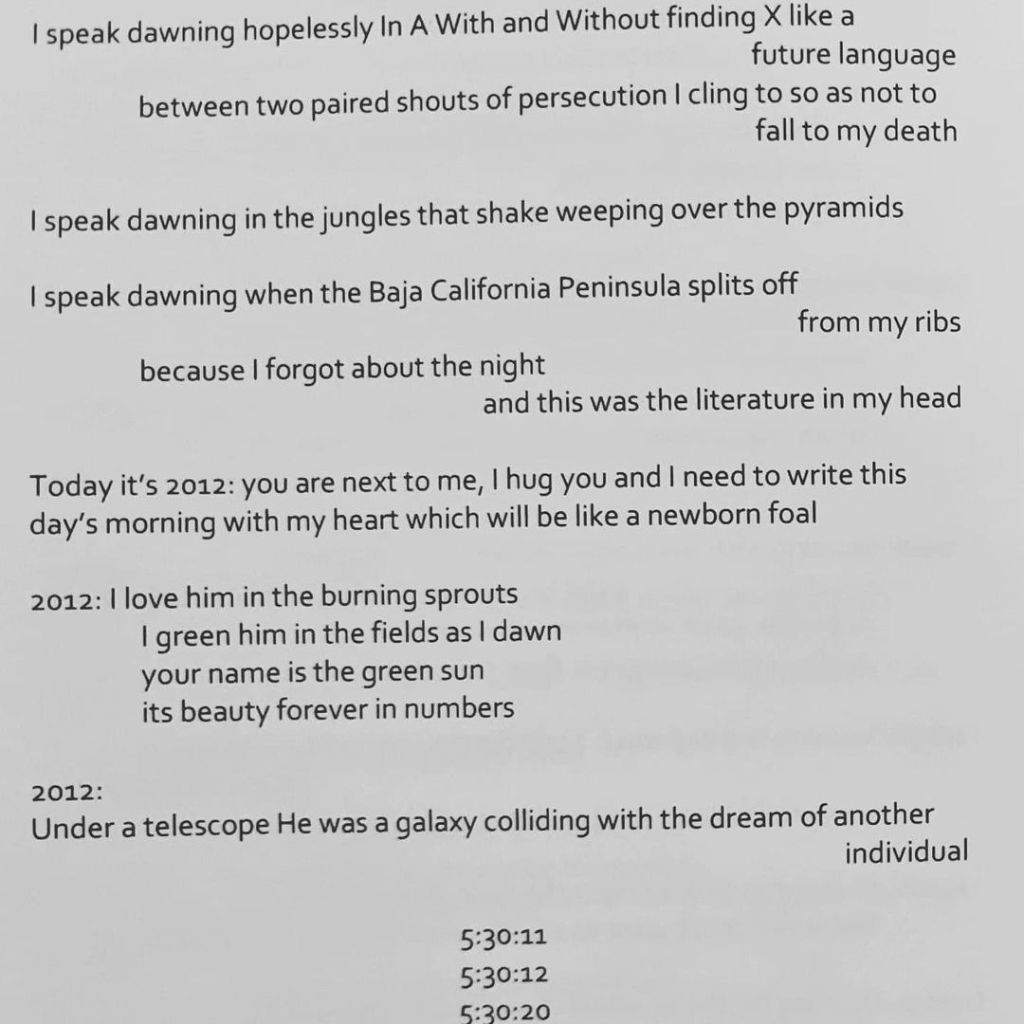 Then I thought: I want to write poetry like that. Not the poetry of a delirium that furiously makes its way in search of gold. I want to write poetry like this underground rain that filters through Mother Earth and gradually finds its way. I want my thinking to fully understand the porosity of the world. I want it to belong not to the golden age but to the age of rain under the earth. Poetry gains something crystalline by remaining like a drop trapped for generations. Is this monumental or is this drinkable? I want my heart to know the porosity of the world and fill the mountain. Someday someone will find it like a spring that rises to the surface.