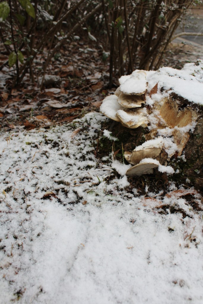 Este fue el último poema que escribí en el barrio de Hanabatake, antes de mudarme a Ninomiya, se trata de un tocón viejo cubierto con unos hongos que llaman saru no kake o «asiento de mono». El tocón se encuentra en el parque de Hidamari y tengo la impresión de que algún vecino raspa el tocón cada cierto tiempo para cosechar los hongos. En invierno volvieron a brotar nuevos hongos al tocón, pero esta vez de un color más blanco. Comparto una imagen del tocón y los hongos el día que nevó, así como algunas imágenes de la nevada pasajera en Hanabatake.
