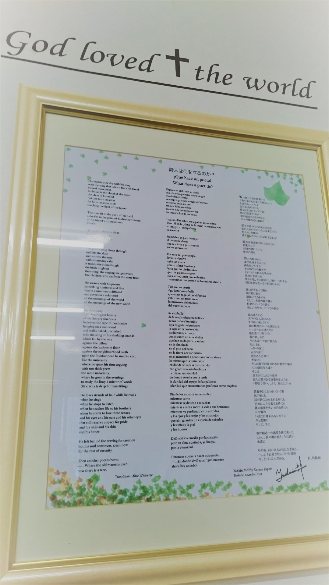 «What does a poet do/ Qué Hace un Poeta / 詩人は何をするのか?», 2021. [signed poem offered to Tsukuba Love of Christ Church], May 2021.