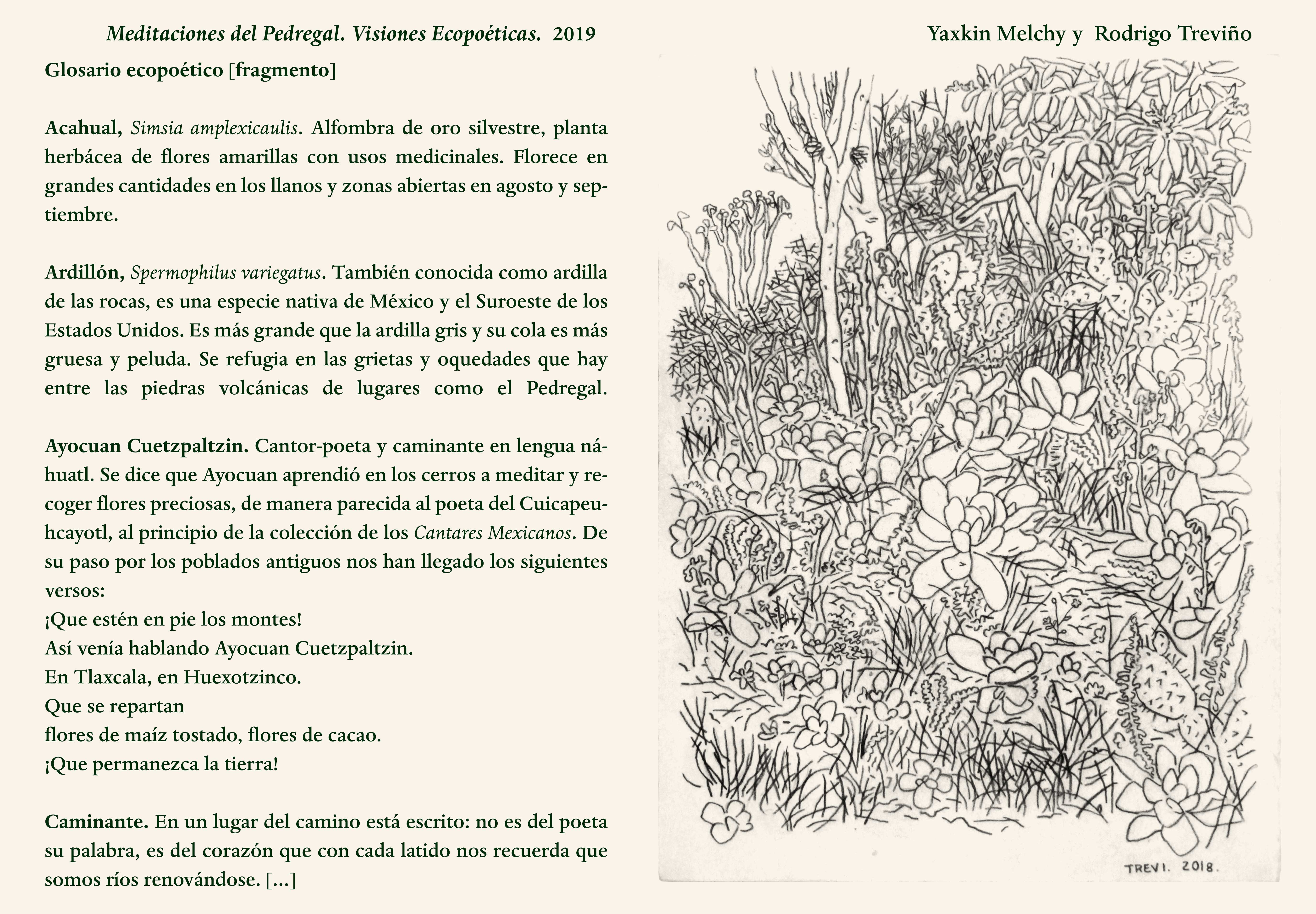 Comparto aquí el enlace a la traducción de un fragmento del prólogo y poemas del libro Meditaciones del Pedregal. Visiones ecopoéticas que salio publicado en versión artesanal en 2019 con el hermoso sello de Astrolabio ediciones de Marina Ruíz. El libro además contiene las ilustraciones de mi amigo artista Rodrigo Treviño. En la selección aparece uno de los dibujos de Rodrigo, aunque claro siempre se antoja verlo también en papel.